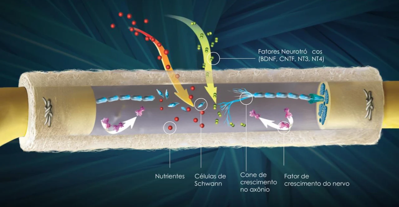 Fornece um ambiente protetor projetado para suportar a migração crítica das células de Schwann e as fases de regeneração axonal.